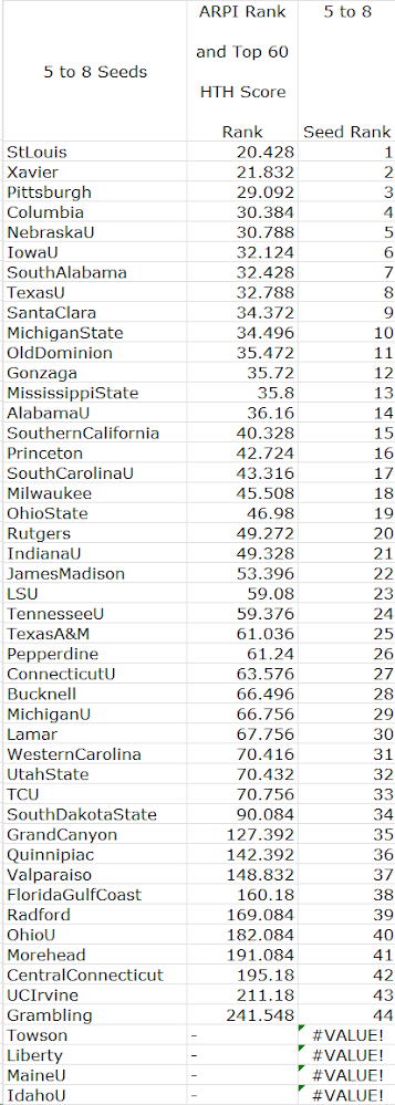 I use 118 metrics to evaluate teams, all based on the factors the NCAA requires the Committee to use in making at large selections. Each metric has two standards. One says "yes," if a team met the standard in the past, it always got an at large position. The other says "no," if a team met that standard in the past, it never got an at large selection. South Alabama met 11 "yes" standards and no "no" standards, thus looking like a sure thing for an at large position. Ten of the "yes" standards, however, included use of South Alabama's RPI rating or its RPI rank. Only one did not: South Alabama's rank in terms of Head to Head Results Against Top 60 Opponents paired with its rank in terms of Poor Results, each weighted at 50%.
